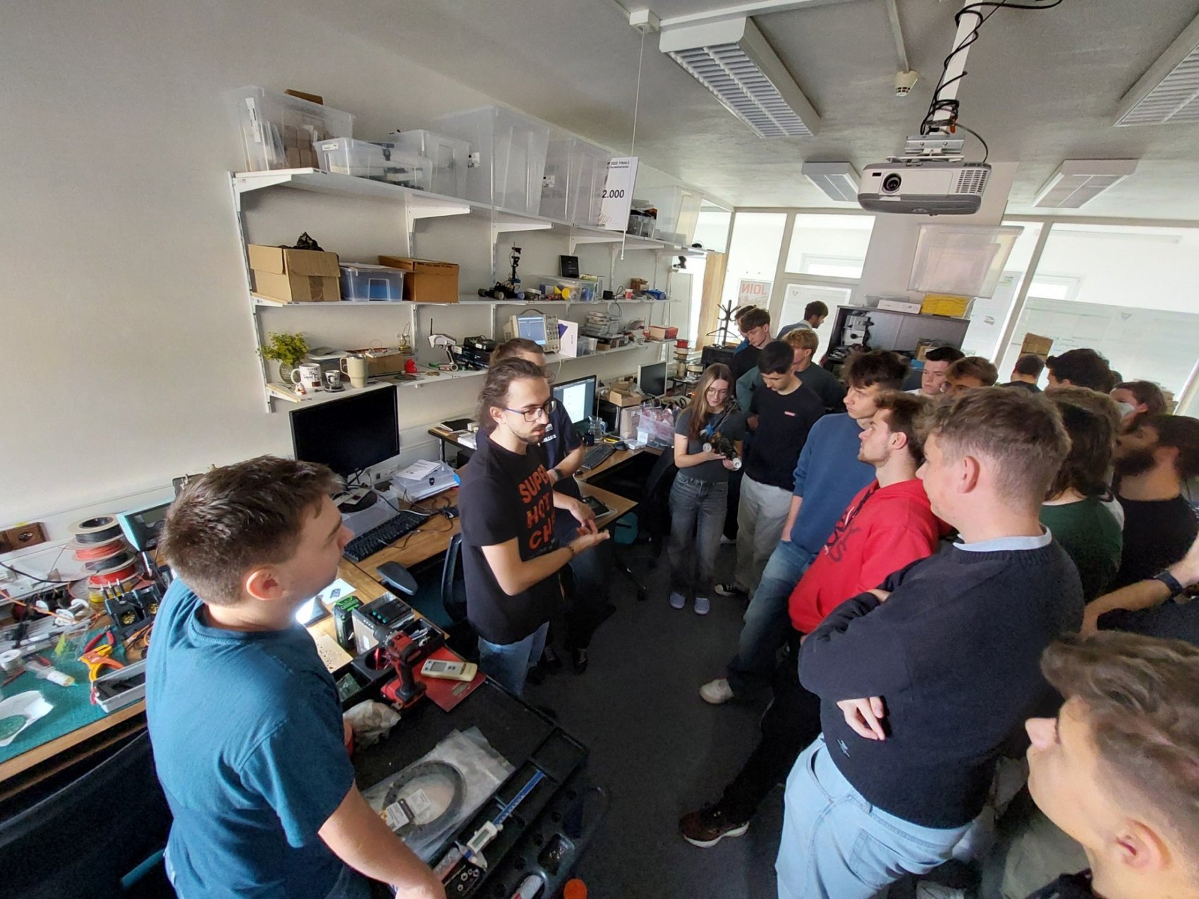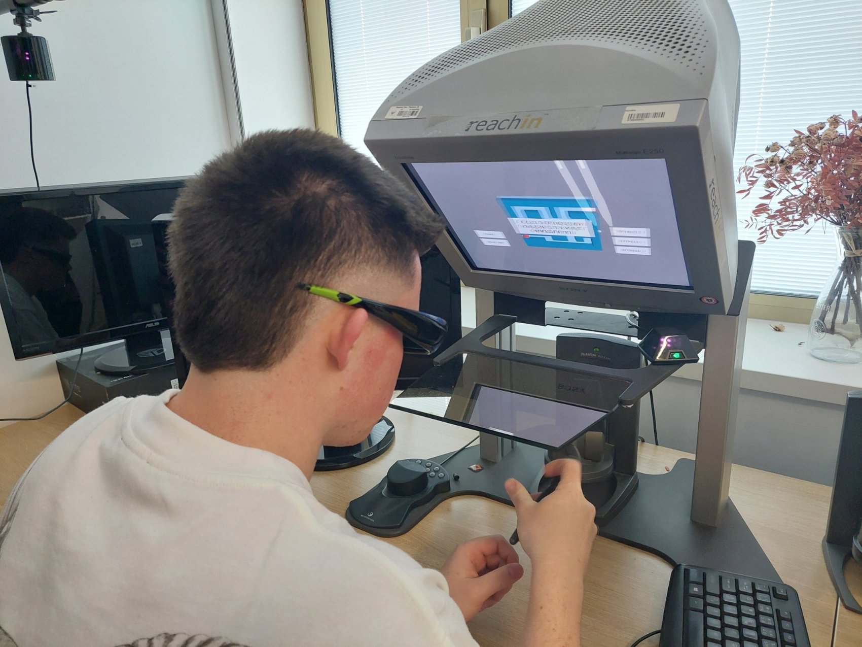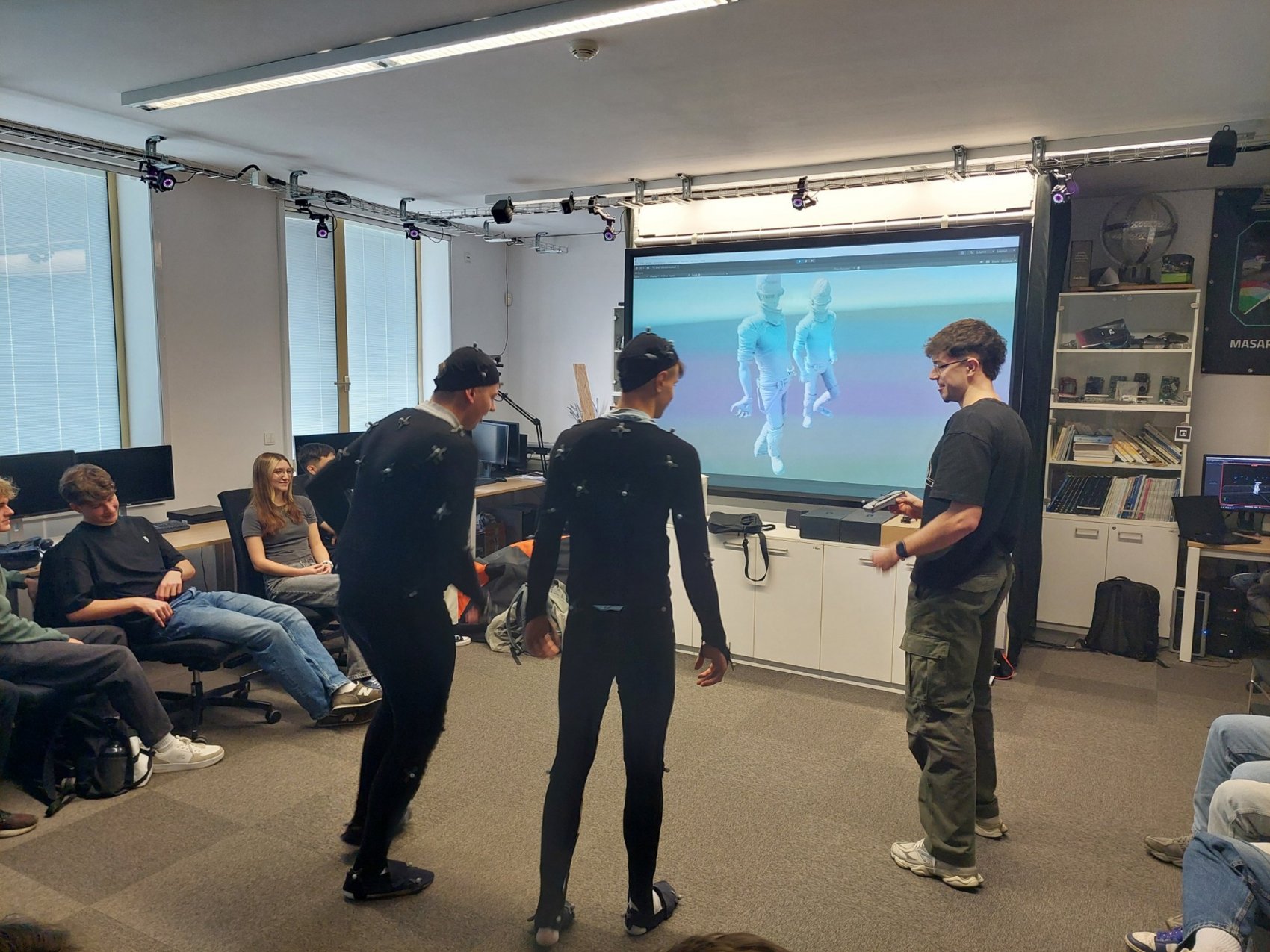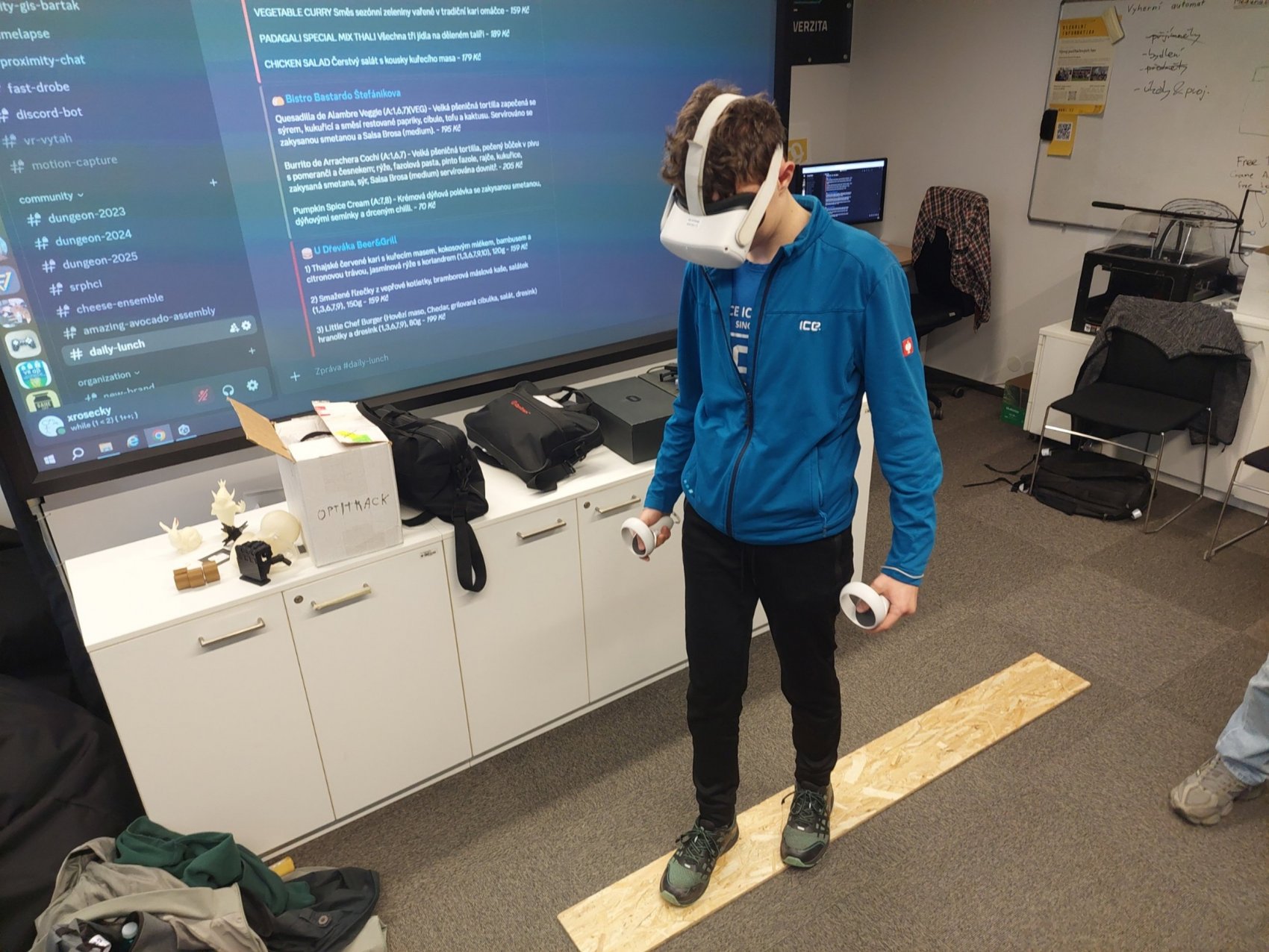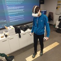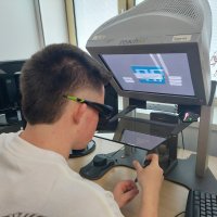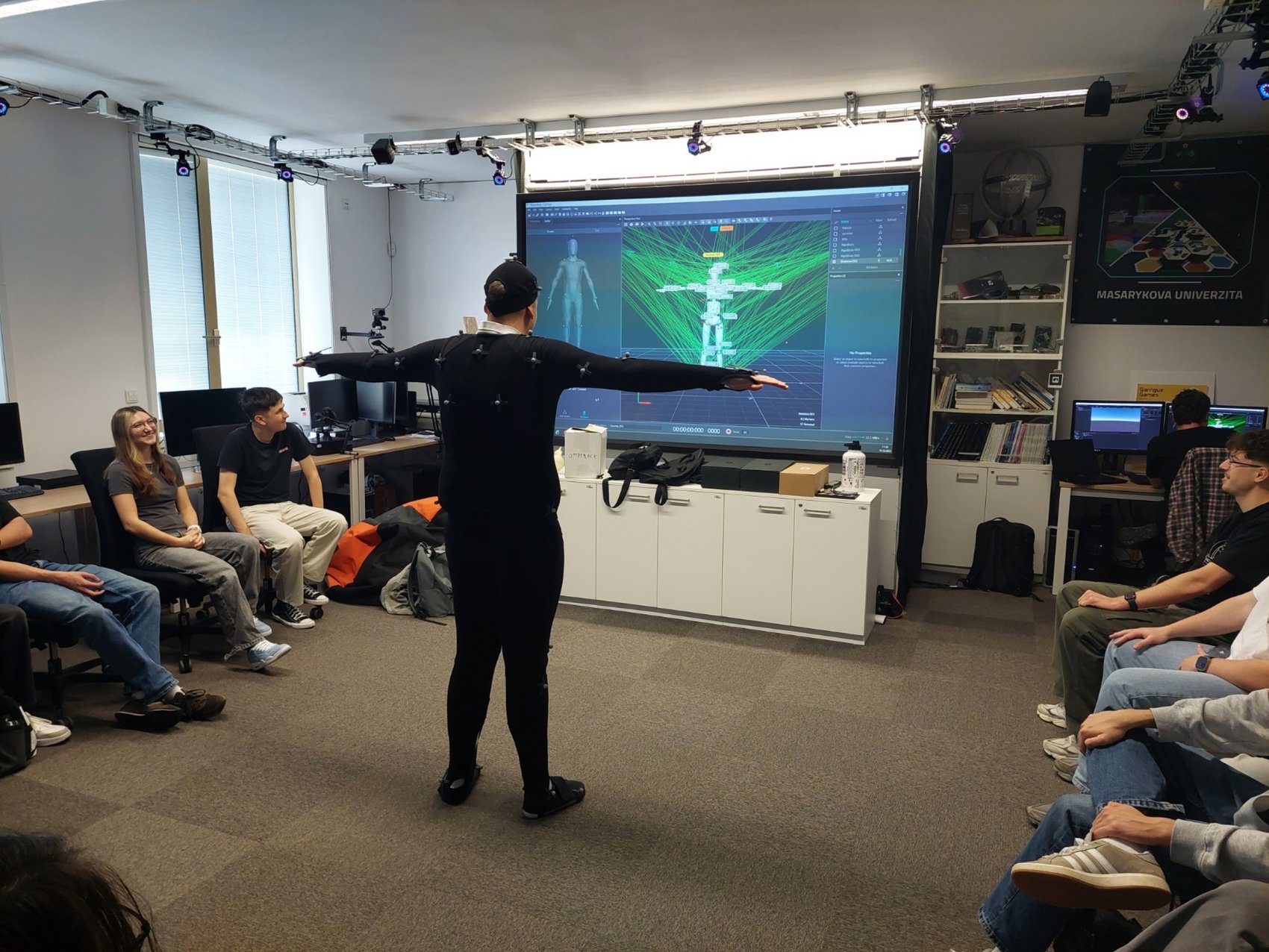 Měli jsme jedinečnou možnost vyzkoušet si moderní technologie – od motion capture systému, který zaznamenává pohyb člověka, přes virtuální realitu, až po práci s haptickým perem, které umožňuje cítit virtuální objekty na dotek. Jonáš nás také provedl fakultou, nahlédli jsme do učeben, laboratoří i studentských prostor, a zodpověděl spoustu dotazů ohledně studia, přijímacího řízení i života na univerzitě.
