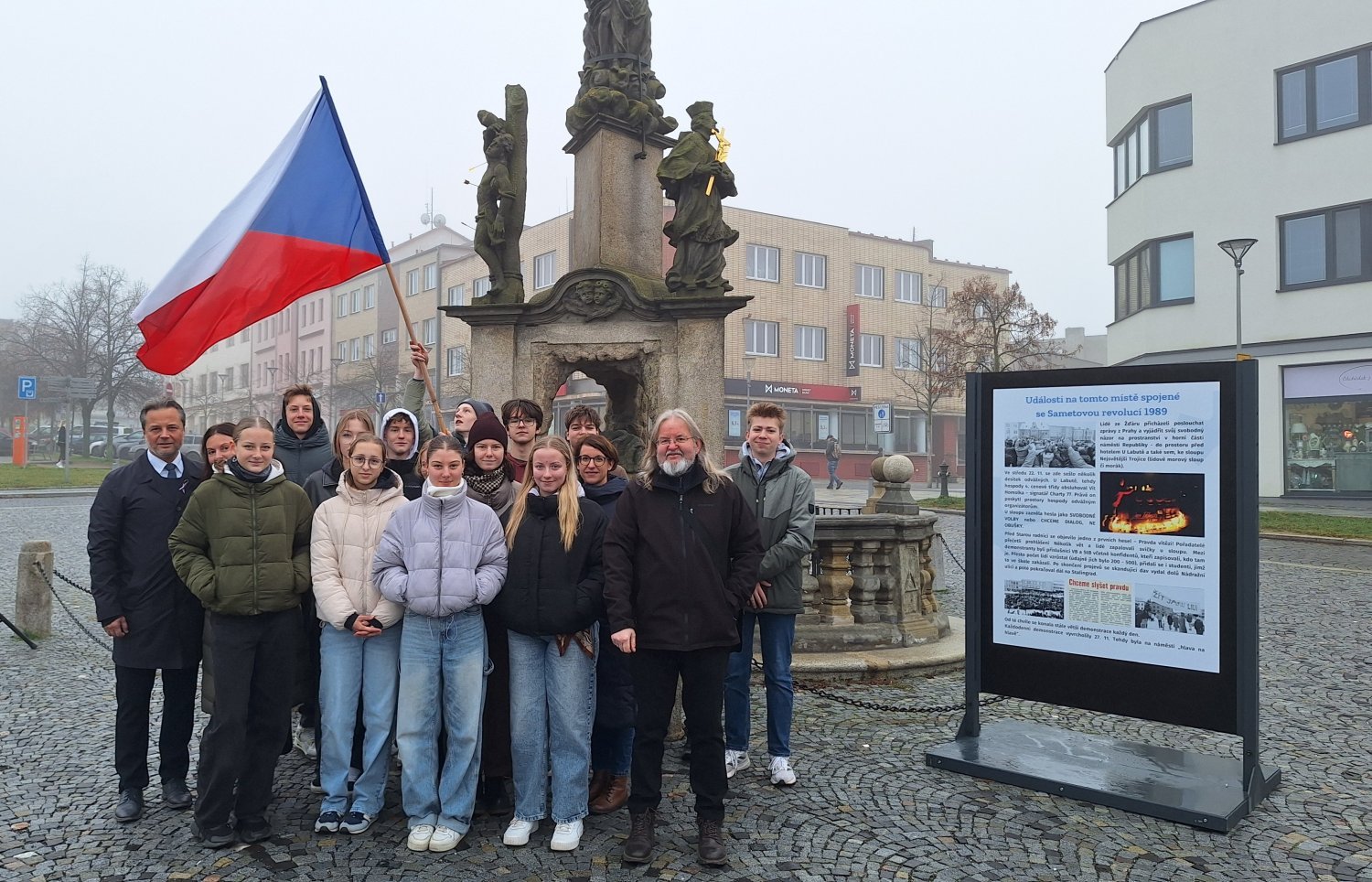 U sloupu Nejsvětější Trojice na náměstí Republiky ve Žďáře nad Sázavou, což je místo spojené se Sametovou revolucí v našem městě, jsme si poslechli slova starosty Mrkose, jeho názor na současnou politickou situaci a apel k mladým, aby nebyli lhostejní k boji za demokracii. Historik Mikule nám přiblížil průběh revolučních dnů ve Žďáře nad Sázavou a zdůraznil, jak důležitá je pro demokratickou společnost respektující komunikace.